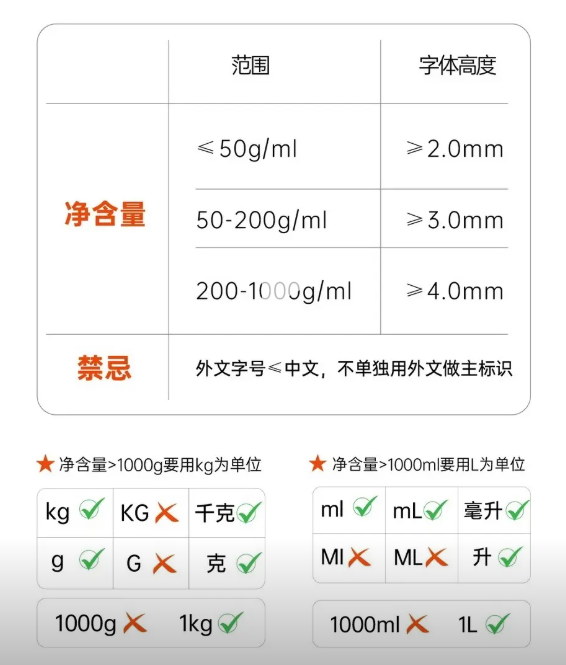 净含量:与食品名称在同一展示面,字符高度根据含量有明确要求(如≤50g 时不小于 2mm),单位需规范(如 “mL” 的 “L” 大写,“kg” 全小写)。