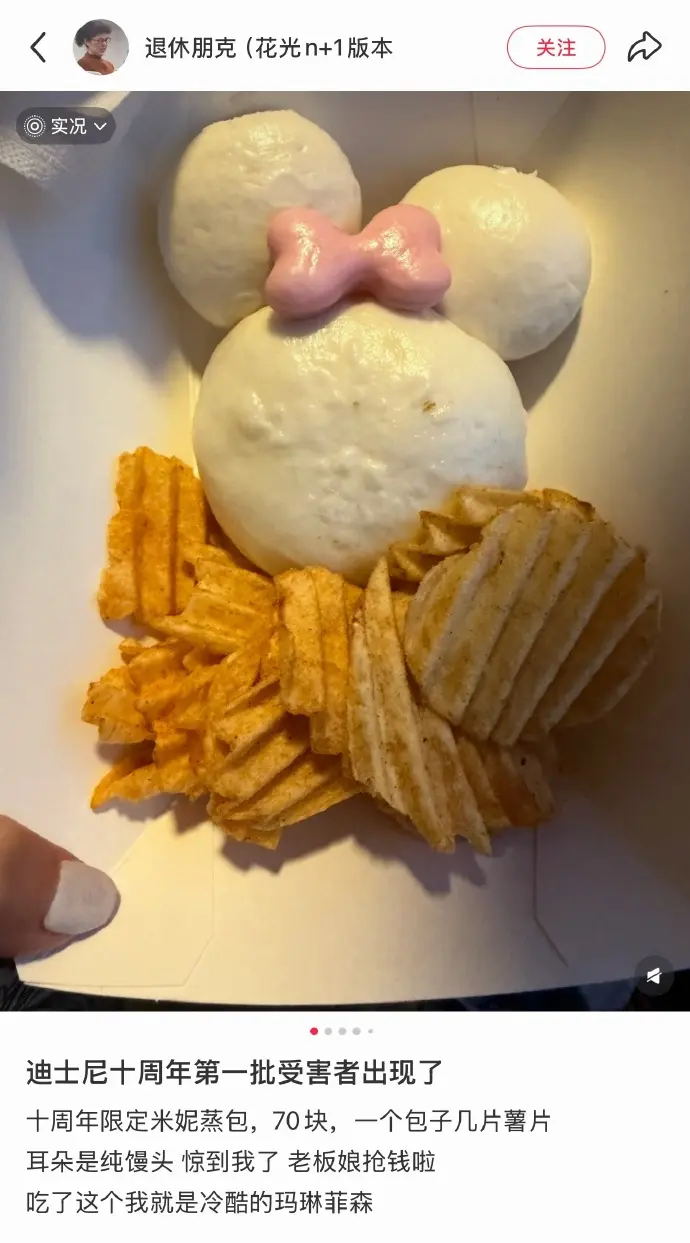 有网友晒出在上海迪士尼购买的十周年限定套餐,套餐内容是一个米妮造型的蒸包搭配薯片,价格为70元人民币。这个价格引发诸多网友吐槽,不少人直言“物价离谱”: