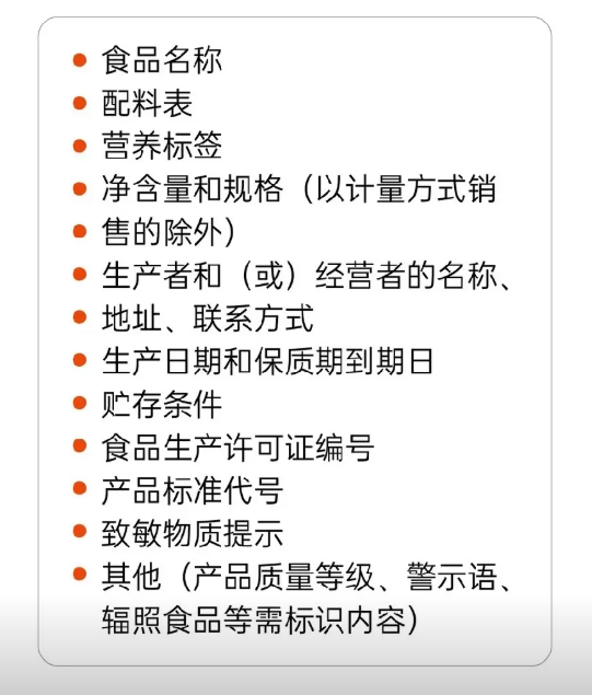 强制标示事项:必须包含食品名称、配料表、净含量、生产日期、保质期、贮存条件、生产者信息、食品生产许可证号(SC 开头)等。
