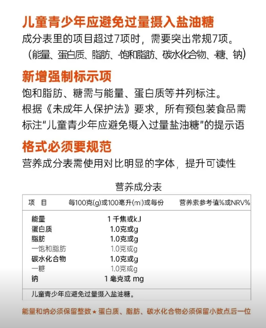 营养成分表:至少包含能量、蛋白质、脂肪、碳水化合物、钠等核心营养素,字体高度不低于 1.8 毫米。